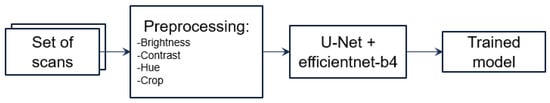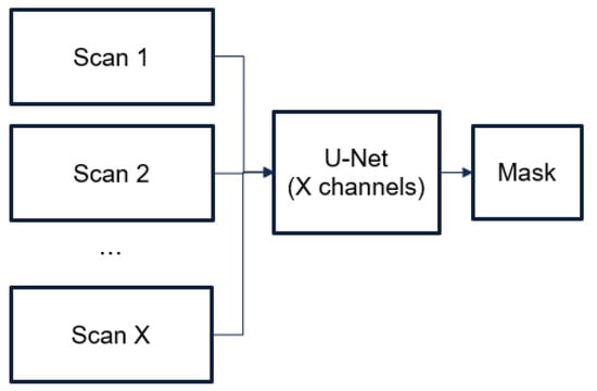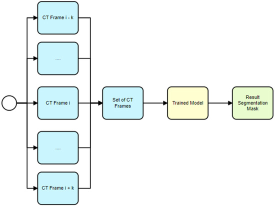 We proposed using adjacent frames of a CT image as a “context” for recognizing hematomas. For this purpose, we proposed an architecture based on U-Net architecture, which supplies several channels as inputs, each of which corresponds to a separate frame (see Figure 5). The training process is similar to the training process of the 2D model (see Figure 6). The input images were composed of 5 images, which were cropped to up to 87.5% of their original size to remove the CT image borders. We trained the model for 40 epochs (after empirical investigation, we considered that 40 were sufficient), using Adam as the optimizer with the same learning rate (0.0001) and a weight decay of 0.001. We used a gamma scheduler with a factor of 0.96 to adjust the learning rate. We applied data augmentation techniques with a probability of 0.4, including strong augmentations.