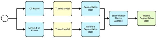 The proposed usage scenario described in Section 3 for the 2D model begins with the input of a CT frame (see Figure 8). To enhance prediction accuracy, a mirrored version of the CT frame is also used. The U-Net model then predicts a recognition mask for both the original and mirrored CT frames. These recognition masks are binary images that indicate where the hematoma is present in the CT frames. The predicted masks for the original and mirrored frames are then averaged to obtain a final, more accurate recognition mask. This final mask is used for further analysis, such as calculating various metrics related to the hematoma. This approach leverages the power of the U-Net model for automated hematoma segmentation and incorporates an innovative technique using mirrored frames to improve prediction accuracy.