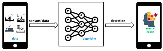 Geospatial activity (GPS) has been used to study mental health problems such as depression [27,28,29,30], bipolar disorder [31], stress [32,33], anxiety [32], and schizophrenia [28,29]. GPS alone cannot be considered a single intervention factor to determine mental health status. Depression or depressive symptoms could result from a chronic disorder or other dispositional factors that GPS cannot detect. Thus, identifying other factors of depression, such as sleep, may help provide early signals for depression symptoms. Also, the individual’s behaviour cannot be expected to be entirely consistent on a daily basis; even a severely ill person can have a good day. Another smartphone sensor, the microphone with voice recognition, has been employed in studies such as the Affective and Mental health MONitor (AMMON) and openSMILE libraries [34,35] to identify emotions and mood. Work on voice recognition is based on predefining several emotions and moods using audio and visual clips to create a library out of the collected voices. Yet, monitoring mental health through voice analysis is not enough, as there should be a reason for mood deterioration; a lack of sleep could be a factor that leads the individual to be in a bad mood during the day, which might influence an individual’s mood overall.