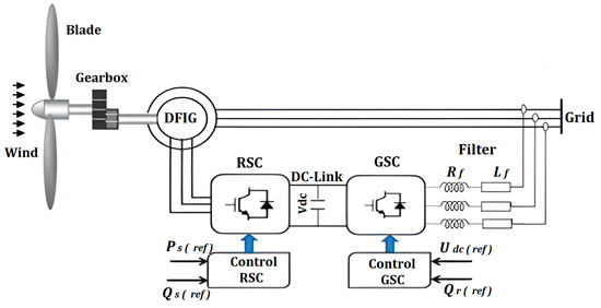 It should be noted that the majority (70%) of wind turbines typically rely on a doubly fed induction generator (DFIG) [9,10,11,12]. This machine has a stator winding connected to the grid through a transformer, while the rotor is connected to the electrical network through AC/DC/AC converters. Thanks to this architecture, the wind turbine can operate in a variable speed range, varying between ±30% around the synchronous speed. This characteristic helps reduce the size of the converters, offering a significant economic advantage over other types of generators [13].