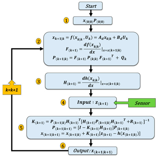 is the state transition model, is the measurement model, is the Jacobian matrix for the state transition, is the Jacobian matrix for the state transition; is the error covariance; is Kalman gain, is the process noise covariance matrix and, is the measurement noise covariance matrix.