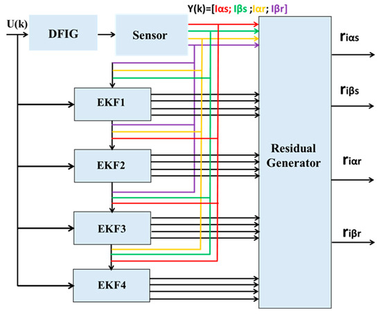 The difference between the measured signals and the signals estimated by each EKF represents the residual values used to detect faults, which are calculated as follows: