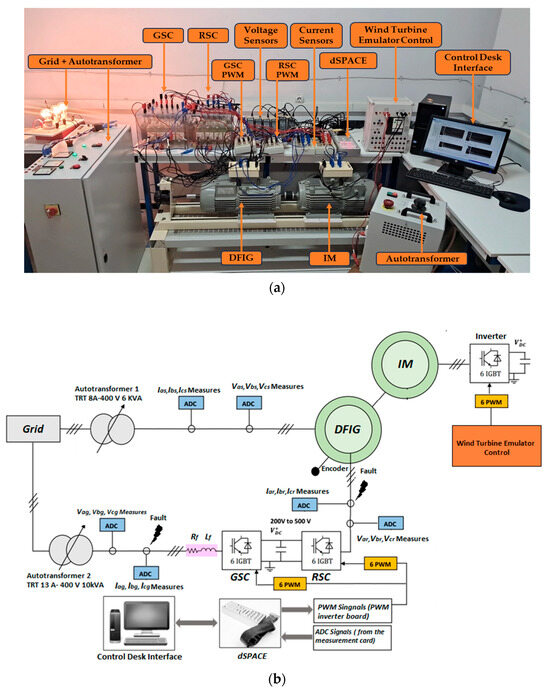 Experimental bench of the wind energy conversion chain emulator: (a) photo, (b) schematic diagram.