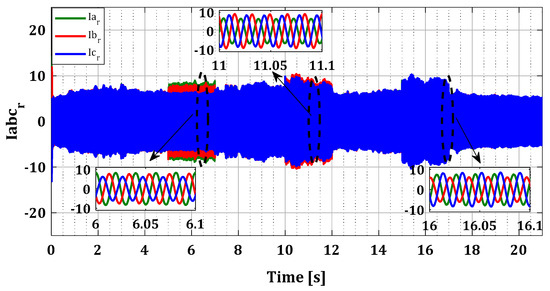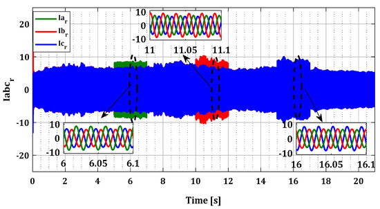 However, the majority of the proposed diagnostic methods depend on the DFIG state model in the αβ or dq reference frames. Although faults have been diagnosed on this reference, it should be pointed out that no sensors are available to measure the currents of these references. Furthermore, creating faults at these references in real time is not feasible, as they are fictitious mathematical representations designed to simplify DFIG modeling with the aim of controlling it. It should be noted that the currents of references alpha and beta encompass all the currents of phases a, b, and c. For example, the current is associated with the Ic and Ib currents. Thus, in the case of a fault in the current, it is possible that the sensor of phase (b), phase (c), or both, is responsible for the fault [34].