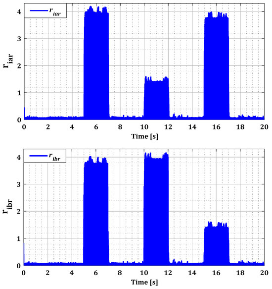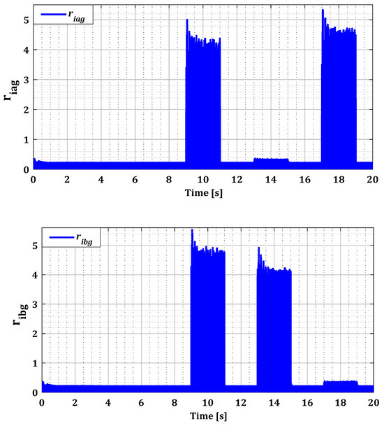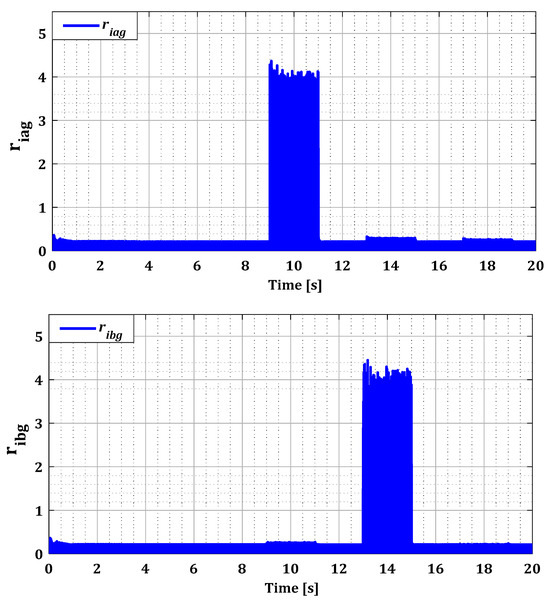 The results in Figure 16 and Figure 17 show that the value of each pair of residuals during the period of multiple faults is greater due to the presence of these faults. However, the third residual is lower compared to the others, indicating that two sensors are faulty, while the third one is in a normal state. For example, in the scenario of sensors failure (a) and (b) during period T12, illustrated in Figure 16, the residuals and are higher than the residual , thus proving that there is a fault in both sensors of phases (a) and (b).