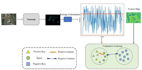 Entropy is a metric of the uncertainty or randomness of data or a probability distribution. The entropy of the probability distribution of each pixel can be used as a measure to determine the uncertainty or confusion of the prediction. If a pixel’s Softmax probability entropy value is low, it means that the model is very certain about regarding its prediction that the pixel belongs to a specific category. Conversely, if a pixel’s Softmax probability entropy value is high, it means that the model is uncertain about regarding its class prediction for that pixel. Based on this, we establish an entropy threshold and select pixel samples with an entropy value lower than this threshold as the negative key. In this way, we can ensure to some extent that the selected negative key is less likely to be a misclassified positive key, thus helping to enhance the precision of contrastive learning. The process of contrastive learning is shown in Figure 2.