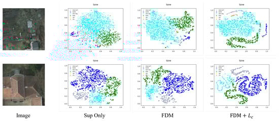 To more clearly demonstrate the effects of our ablation study, we have additionally incorporated t-SNE visualizations using the Potsdam dataset, as illustrated in Figure 5. From these visualizations, it is evident that the feature disturbed module contributes to optimizing the feature space. Furthermore, employing contrastive learning on top of FDM significantly enhances the optimization of the feature space. This combination of techniques clearly delineates the improvements in feature representation and model performance.