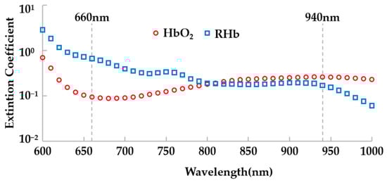where HbO2 refers to oxyhemoglobin, while RHb represents total hemoglobin. The calculation of SpO2 relies on the different absorption rates of oxyhemoglobin and total hemoglobin for specific wavelengths of light. Typically, the reflectance of human tissue across two distinct wavelengths, such as 660 nm and 940 nm, is analyzed to determine SpO2. Figure 2 provides an illustration of the light absorption by different components of the blood.