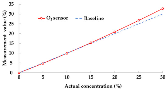 In practice, relying solely on formula (3) may not yield accurate measurements due to the slight nonlinearity in the sensor. For example, Figure 4 illustrates the measurement deviation of the O2 sensor in its original state. Our essential task is to achieve precise measurements by establishing a mapping relationship between the measured values and the actual gas concentration through proactive calibration. Given the potential changes in the properties of electrochemical sensors over time, regularly calibrating the gas detection function in the miner lamp is essential to maintain accuracy.
