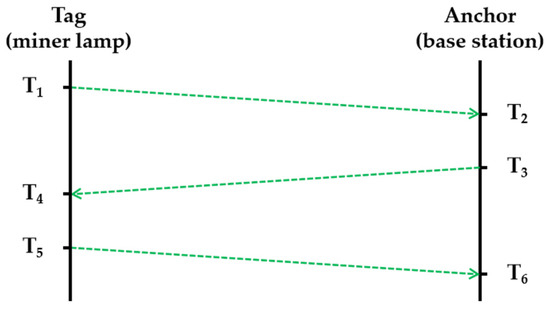 UWB is widely acknowledged as the optimal choice for personnel positioning in mines [34,35], due to its impressive range, precision, and robustness in challenging tunnel environments. The theoretical accuracy of UWB ranging can achieve millimeter-scale or even higher resolutions due to the picosecond-level timestamp accuracy of pulses. However, many factors, including clock offset between the anchor and tag, can significantly impact actual positioning accuracy. To address this issue, the double-sided two-way ranging (DS-TWR) method is adopted [36], achieved through round-trip exchanges between the anchor (base station) and the tag (miner lamp) via polling, as illustrated in Figure 5. The ranging process begins with the tag initiating a signal transmission along with a timestamp, and the signal undergoes 3-trip exchanges between the tag and anchor via polling. During the final trip, an end-of-transmission signal is added to indicate the completion of a full ranging.