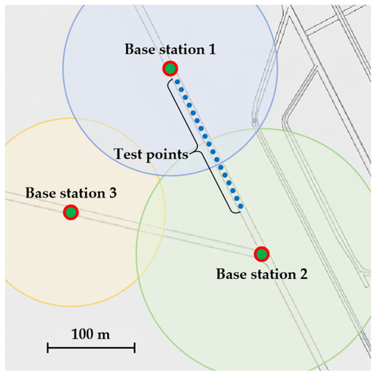 When considering the deployment of 5G base stations operating on the 3.5 GHz frequency band, it is worth noting that the coverage radius of a single base station is approximately 200 m [37]. Signal quality rapidly declines beyond this range, as illustrated in Figure 7, which shows a partial map of the base station coverage in the mine. In the traditional cellular network architecture [38], each base station represents a cell, leading to frequent cell handovers [39] when user terminals are on the move, compromising communication performance, particularly in terms of latency. Furthermore, the complex electromagnetic environment and multi-path effects in confined spaces further limit the performance of individual base stations.