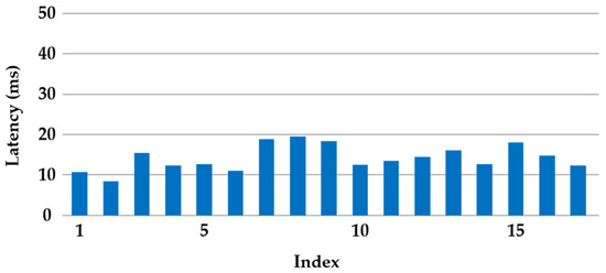 To address these challenges, distributed multiple-input multiple-output (D-MIMO) [40,41] networking is implemented. This technique effectively enables collaboration among neighboring base stations, allowing them to collectively serve a single user terminal and thereby enhancing overall network coverage. Additionally, as a form of MIMO technology, it naturally exhibits characteristics such as interference suppression and fading suppression. Within a mine tunnel, specific test points between two neighboring 5G base stations, as marked in Figure 7, were selected to measure the latency changes from underground terminals to the surface server during continuous movement, as depicted in Figure 8. Upon repeated verification, it was observed that the maximum latency does not exceed 20 ms, indicating the transformation of this tunnel into a cell-free area where changes in position have no impact on latency.