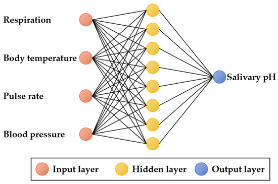 Backpropagation [46] is a mature neural network algorithm that learns through data training to achieve the mapping of input and output. In this application, we use a 3-layer neural network with appropriate parameter settings to simulate complex nonlinear mappings. The input layer consists of four neurons: respiration, body temperature, pulse rate, and blood pressure. These inputs are processed through the hidden layer and mapped to the output layer, which represents the pH value of saliva. The number of neurons in the hidden layer can be determined using the following empirical formula: