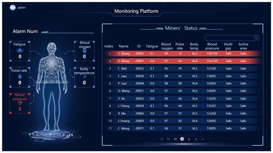 In general, data management is composed of two software components. The first is a mobile application installed in the miner lamp. Its primary functions are to display data on the screen and upload it to the server. The second component is a monitoring platform located on the surface server. This platform assesses the safety and health status of all miners, estimates their fatigue levels, and presents the results via a web interface as shown in Figure 10. Additionally, it receives information from the server through MQTT (Message Queuing Telemetry Transport) and forwards it to the electronic bracelet.