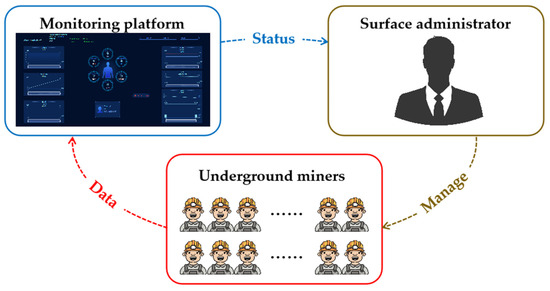 Interaction among underground miners, monitoring platform, and surface administrator.
