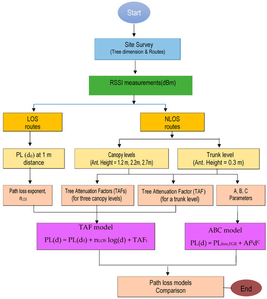 where represents the attenuation in a forest caused by M trees, the subscript i represents the number of direct waves through the trees, and is the PLE of the LOS route. Four different TAFs were derived for antenna heights of 0.3, 1.2, 2.2, and 2.7 m representing the trunk, bottom canopy, middle canopy, and top canopy levels, respectively. The forest attenuation factors were also classified into either trunk attenuation factor or canopy attenuation factor. The proposed models were completed from field measurements in the next section as shown by a flowchart in Figure 1.