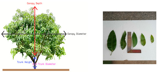 Measurements were taken at a Ruby mango plantation in Sakaeo Province of eastern Thailand (13.4166954° N, 102.1368925° E). To ensure a good harvest, Ruby mango trees must be planted at a certain density. Thus, the plantation follows a specific pattern. The trees were planted in straight lines with 6 m between rows and 5 m between trunks in the same row (Figure 2). There were 320 mango trees per hectare. Figure 3 (left) and Table 1 present the measured tree parameters. The trees had an average height of 4.5 m, which comprised the trunk height (0.55 m) and canopy depth (3.96 m), and an average canopy diameter of 5.69 m. Additionally, leaf dimensions were between 15–33 cm. as shown in Figure 3 (right).