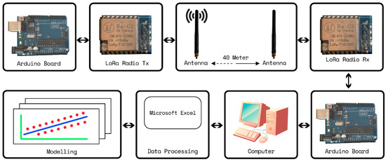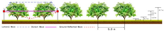 The following equipment was used for propagation measurement: a fixed 433 MHz LoRa module (i.e., transceiver and omni-directional antenna) as the receiving station and a portable LoRa module as the transmitter. This frequency band is allowed only for the Asia region. This study used omni-directional antennas both as the transmitter and the receiver in order to obtain the surrounding effects in the proposed model. These modules were connected to a microcontroller (Arduino board) that programmed the transmitter to wirelessly send a data packet containing the word “hello” with the RSSI to the receiver every 1.5 s, as shown in Figure 4. Since this study was only focused on the wave propagation characteristics through the Ruby mango trees, therefore, a spreading factor (SF) of 7 and a bandwidth (BW) of 125 kHz were used to obtain the best RSSI and time on air. Table 2 summarizes the equipment parameters. To model the path loss, the RSSI data were captured by a notebook computer at the receiving station, while the portable transmitting node was moved in intervals of 5 m up to 40 m in both the forward and reverse directions. The antenna heights of the transmitter and receiver were varied at the same heights of 0.3, 1.2, 2.2, and 2.7 above the ground, as shown in Figure 5. This make waves propagate via the tree classified into three parts, namely (1) Ground-reflected wave, (2) Direct wave, and (3) Lateral wave. In order to obtain the correct measured data, the measurements were repeated three times, both forward and reverse routes without strong wind or rain. The measurements were divided to 2 routes for path loss modeling and validation with a total of 7680 measured RSSIs.