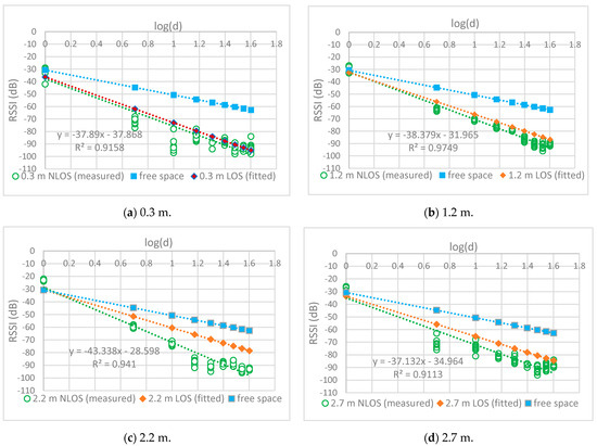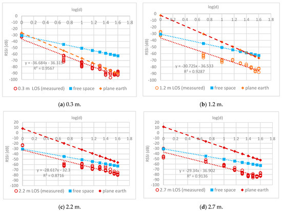To characterize the signal attenuation through trees, RSSI measurements were taken along LOS routes in a Ruby mango plantation. Data were measured along LOS routes every 5 m in a tree line for different antenna heights. Figure 6 shows the relationship between the RSSI and distance for one LOS route. The relationships at different antenna heights can be represented as follows: