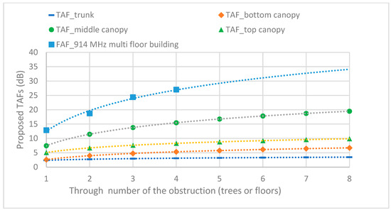Table 3 presents the TAFs through the first to eighth trees. The middle canopy had the largest TAF because of the large canopy volume while the trunk had the lowest TAF because it presented the smallest obstruction. The validation of the proposed modes provided good agreements, especially in canopy levels because of the symmetry pattern. However, in the case of the trunk level, there was an error with RMSE for the validation since the trees in each row were not in a straight line. The table also presents the A, B, and C parameters in Equation (2). The B parameter was 0.39 for all cases which represent the single frequency of 433 MHz. Figure 8 shows that the proposed TAF followed an exponential curve according to the number of through trees, which is similar to through floors with FAF for multistory buildings [29]. From the above results, a suitable distance between the communication nodes is approximately 35–40 m with the specific SF and BW for network planning for this farm and similar environments.