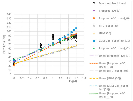 The RMSEs of the models are compared in Table 5. The proposed TAF models provided a more accurate prediction than the three conventional models, with the best MAE of 2.22 dB and RMSE of 2.65 dB. Figure 9, Figure 10, Figure 11 and Figure 12 compare the proposed models with the three conventional models at different antenna heights. Note that the large deviation of measured path loss occurred at the trunk level with a MAE of 4.79 and RMSE of 6.2 (see Figure 9). Additionally, the MAE was smaller than the RMSE because of the deviation of the path loss measurement at the bottom canopy. (see Figure 10). The models provide minimum path loss since there are a little leaf in the bottom canopy level. The proposed ABC model provided a good prediction accuracy overall, however the proposed TAF model generally provided the best prediction accuracy because of influence from TAFs through the trees. At the trunk level, the out-of-leaf ITU-R and FITU-R models had a large error, with RMSE of 21.65 dB and 22.59 dB, respectively, while the out-of-leaf COST 235 model demonstrated a better prediction accuracy with RMSE of 11.77 dB, as shown in Table 5. At the canopy levels, the proposed TAF model still demonstrated good prediction accuracy, especially at the bottom canopy level, which had the lowest leaf density. Similarly, the proposed ABC model still provided good prediction accuracy at distances greater than 10 m. The in-leaf COST 235 model also performed better than the in-leaf ITU-R and FITU models.