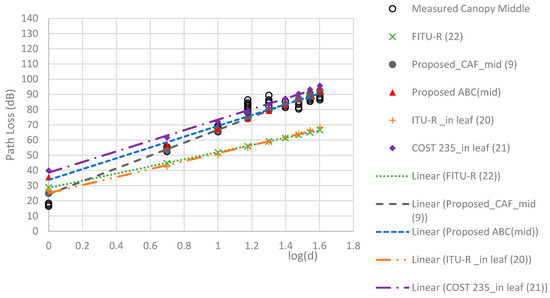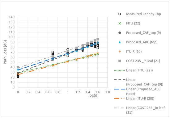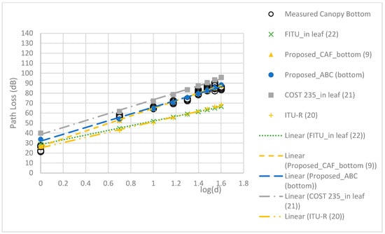 Similarly, the difference was also smaller at an antenna height of 2.7 m (Figure 7d) than at an antenna height of 2.2 m, because the waves propagated through less dense foliage in the top canopy, and the waves diffracted at the top of the canopy. The NLOS path loss model expressed by (14)–(17) was similar to the free-space model (CI).