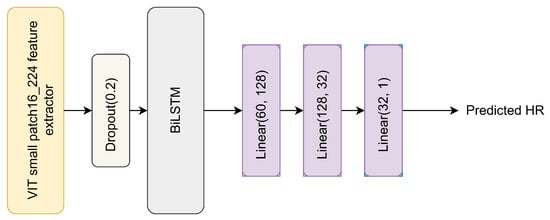 The model consisted of a VIT feature extractor to extract the spatial features followed by a BiLSTM layer to extract the global features and three linear layers used as an estimator to estimate the heart rate value. The BiLSTM layer was used to handle the features of multiple frames (we chose 15) since LSTM can selectively remember or forget information according to its importance, though an attention mechanism could be used here instead. LSTM maintains the order of embeddings, with the output at time t depending on the output at ; thus, because of its sequential property, it is more effective for video analysis. The feature extractor was chosen based on experiments (more details are provided in Section 4.2). The MAE (see Equation (1)) was used as the loss function.