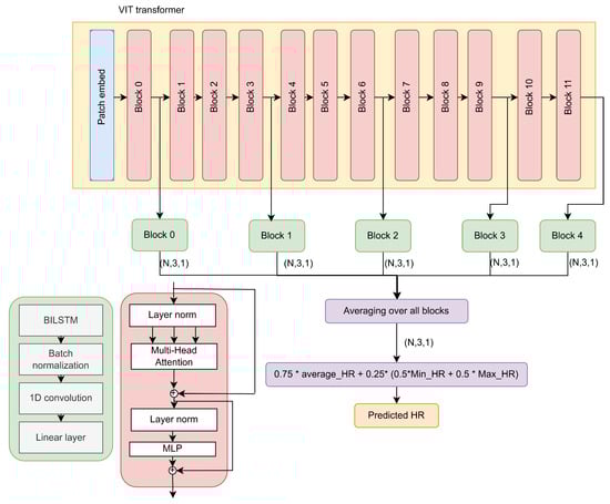 The modifications included taking multi-skip connections from five different blocks of the VIT feature extractor. As we know, each block attends to different features. This allows the model to obtain diverse spatial feature maps from the image. In other words, the spatial features taken from the five different blocks differ from each other. Since the Vit_small_patch16_224 feature extractor used in our model consists of 12 blocks, we chose to take the connections from five blocks that were of different depths. From Figure 4, we can see that the connections were taken from blocks 0, 3, 6, 9, and 11. We included a distance of three blocks to avoid redundancy, as feature maps from blocks that are relatively close in depth are similar to each other. Each connection was fed into a block consisting of a BiLSTM layer to capture the global features, followed by batch normalization, a 1D convolution layer, and a linear layer to estimate three values: the minimum, maximum, and average heart rate. During the training phase, the outputs from the five blocks were averaged, and the MAE loss function was used as the criterion. In the prediction phase, the three values were combined as shown in Equation (3) to estimate the final heart rate value.