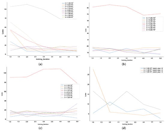 The results of the experiments for tuning the hyper-parameters, (a) Batch size = 2, (b) Batch size = 4, (c) Batch size = 8, and (d) shows the best combinations.