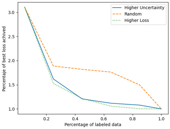 To validate this hypothesis, a series of experiments were conducted. Our initial dataset comprised a randomly selected 5% of the available data. Upon training, the final loss was computed on the test dataset. Thereafter, in increments of 20% of the dataset’s size, new samples were incorporated into the training subset, followed by model retraining. The sample selection process was guided by three distinct strategies: (i) selecting samples with the most pronounced loss (not feasible in realistic scenarios due to the prerequisite of labels to compute the loss), (ii) opting for samples with the highest uncertainty, and (iii) random sample selection. To enhance the robustness of our findings, this procedure was replicated ten times, and the results were averaged to mitigate the influence of outliers and anomalies.