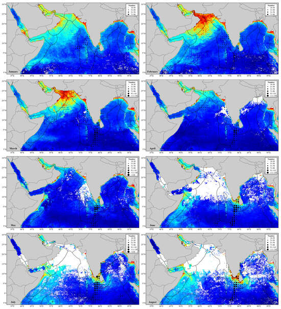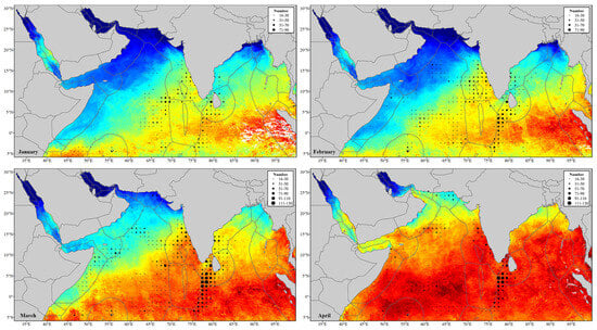 The winter northeast monsoon and summer southwest monsoon have significant impacts on the distribution of fishing vessels in the northern Indian Ocean [37]. The northeast monsoon periodis characterized by weaker wind (mostly at grade 3 to 4), dry and clear weather, and good visibility on the sea surface, making this period suitable for fishing operations. On the other hand, during the summer monsoon period, the wind gets stronger (reaching up to grade 6 to 7 in the Arabian Sea and up to grade 10 in its western area), also with humid and rainy weather and decreased visibility, making this period unsuitable for fishing operations [38]. Additionally, the spawning period for many catch targets occurs in summer. The summer southwest monsoon induces upwellings, transferring nutrients from the lower layers to the surface waters and creating favorable conditions for the reproduction of the catch targets. The reduced fishing operations during this period are beneficial for minimizing disturbances to the breeding activities and promoting the growth and development of the catch targets [39]. Therefore, the northeast monsoon period (October to March) is often the fishing season, with widespread distribution and frequent fishing operations, while the southwest monsoon period (April to September) is considered the fishing moratorium, with few fishing vessels distributed.