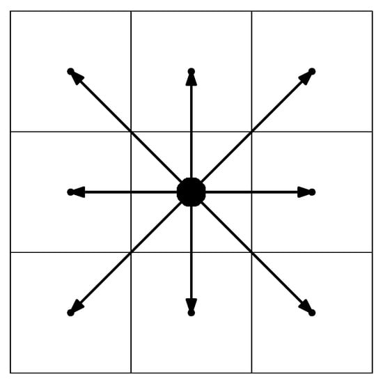 The central cell is connected to all 8 cells surrounding the cell. Here, a connected cell of the central cell is marked with an arrow.