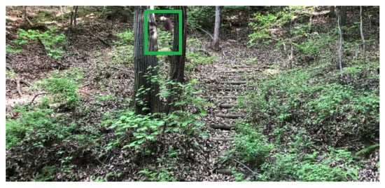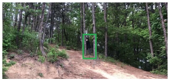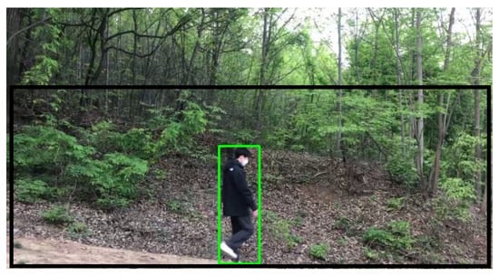 Our human detection system was tested with a video file, which shows a person passing by in 1920 × 1080 resolution. The video file recorded a person moving in mountains. One human image in the video file is plotted in Figure 2. In Figure 2, a green box indicates the ROI of the moving human detected using the proposed method.