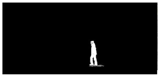 Bounding boxes with human area size are set as Regions of Interest (ROIs). Each ROI is set as the object classification input image, so that the object classification is enabled inside the ROI. In Algorithm 1, a bounding box inside the set is used as a ROI for object classification. In Figure 2, a green rectangle indicates the ROI of the moving object (human) detected using the proposed method. In Figure 3, the GMBS and ConnectedComponentsWithStats are applied for detecting a moving object in Figure 2. In Figure 3, white area indicates the silhouette of a moving object. Once a moving object is detected in a frame, then one generates the ROI of the moving object.
