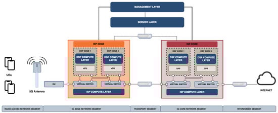 - The software components in the service and compute layers of the ISP edge start extracting data as the traffic from the UEs cross the network. The exchanged data are shown in Figure 2 by red circles.