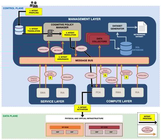 This subsection describes the different software components necessary not only for the achievement of intent, but also for the dataset creation process. The data extraction process is detailed in Figure 2 by orange arrows and red circles. The infrastructure network approach is in line with the self-managed protection architecture proposed in [20]. It consists of a set of network software components distributed in the three layers previously defined working together to conform a cognitive closed-loop system. Each component runs a specific task and the combination of all of them leads to the accurate enforcement of network control rules. Such control rules have been previously translated from an intent. As depicted in orange in Figure 2, the communication and data exchange between components are facilitated by a message bus software through a publishing and subscription architecture. The red circles represent the type of data being exchanged in each case, while the orange arrows represent whether it is a subscription or a publication to that data exchange. The software components are described below.