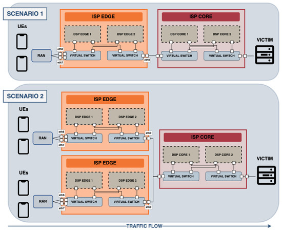 The design of Scenarios 1 and 2 are displayed in Figure 3. Scenarios 3 and 4 follow the same design as Scenario 2, including a higher number of UEs connected to each edge. They have not been added in the figure for simplicity. For the same reason, network control layers have also not been included in the figure. Note that the number of UEs connected to the RAN has been chosen for specific use cases to have variety. However, this number can be extended, as well as the number of edges connected to the core network. This extension of the architecture is easily achievable using the CORE emulator, being a widely scalable network.