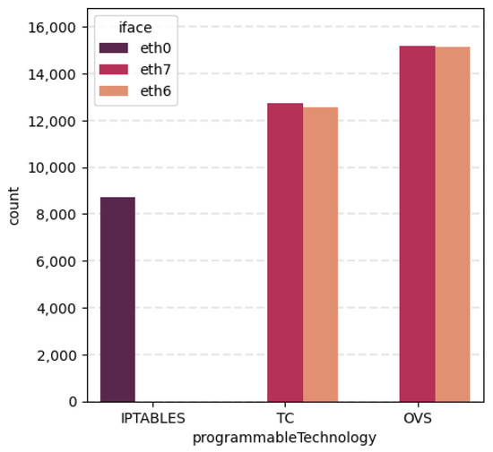 Focusing now on specific features, Figure 5 reveals interesting information connecting iface and programmableTechnology variables. The count plot is divided in the three data-plane technologies (iptables, OVS and TC) used for the enforcement of the network policy. In addition, such division is classified taking into account where this policy is performed in terms of its network interface. Thus, we can observe that all actions performed with iptables are enforced in network interface eth0, while TC and OVS vary between eth6 and eth7. This graph confirms the successful performance of the autonomous control loop, since the network policies are performed at the interfaces analysed in Section 4.3.