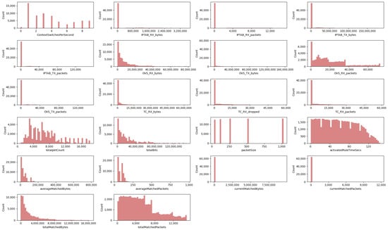 Following the technical validation of our numerical features, we present Figure 7. It represents the data distribution graphs of the numerical columns in the IW-IB-5GNET dataset. A wide variety of shapes in the data distributions can be observed in the figure. First, we can identify discrete values such as ContextSwitchesPerSecond or packetSize. Focusing on the packetSize graph in Figure 7, the five different packet sizes chosen for the experiments can be observed. These are 32, 128, 256, 512 and 1024 bytes. Many histograms with exponential shapes are also present in the figure, such as the features totalBits and totalMatchedBytes. The totalBits feature indicates the number of bits actually traversing a particular network interface, while totalMatchedBytes designates the total number of bytes that match the network rule being monitored. Finally, we observe a variety of non-uniform shapes. Most of these have a high maximum value and much smaller cluttered values around it. Examples of these are totalpktCount or totalMatchedPackets. Looking at the graph of total matched packages in Figure 7, we can observe that the majority of values are around the mean, which is 5031. Additionally, its maximum value is 14,855 which indicates that in some of the experiments the rule matches a high amount of packets.