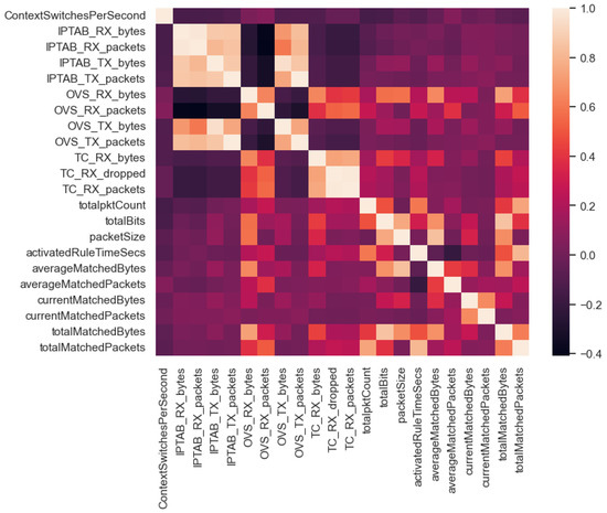 To conclude with the technical evaluation of the IW-IB-5GNET dataset, the correlation coefficients of the numerical features have been calculated. The technique used was the calculation of Pearson correlation coefficients (PCC), which measures linear correlation between two sets of data. The coefficient values vary between −1 and 1, which indicates the strength and direction of the linear relationship between two variables [35]. Figure 8 shows the correlation matrix obtained from these coefficients. It can be seen that features with high correlation are represented with a very light orange colour. In contrast, features with high negative correlation are represented with a dark purple. Features with low correlation between them are represented with intermediate colours. For instance, there is a clear positive correlation between bytes and packets of every pair of features associated with the same monitored instance (i.e., the more packets received, the more bytes received). An example of this can be found at the second and third features in Figure 8, IPTAB_RX_bytes and IPTAB_RX_bytes, respectively, where the very light orange colour representing their positive correlation can be noted. Focusing on very negative correlations, we look at the averageMatchedPackets feature with the activatedRuleTimeSecs feature. The more time a rule is active on the network, the fewer average packets matched that rule. In general terms, we observe a clear linear relationship in the lower right part of the correlation matrix. This corresponds to the metrics associated with the network rules, which are highly variable during the execution of the experiments. On the other hand, there is little linear dependence of the metrics associated with iptables with respect to the rest of the features. This is due to the fact that iptables is located at the egress interface of the edge network. Thus, traffic does not pass through in many of the experiments because the traffic is dropped before reaching the egress interface.