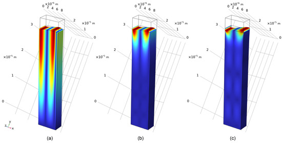 The displacements of these two modes are qualitatively similar; however, the transverse Rayleigh mode decays more rapidly into the substrate. The calculated velocities are 4172 and 4076 m/s. Brzozowski et al. [23] have calculated the wave velocities on free and metalized surfaces and found them to be 4171–4226 m/s and 4077–4112 m/s, with the exact result dependent on the particular source chosen for the material parameters. Our simulated results are therefore consistent with that report. The transverse Rayleigh mode is also obtained when a gold layer of 0.15 × 10−6 m thickness is added, although the wave velocity decreases to 3738 m/s (Figure 2c).