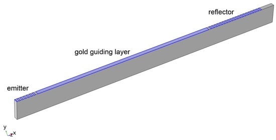 For the sensor design presented in Figure 1, finite element simulations were performed in the frequency domain in order to determine the amplitude and phase changes resulting from changes in the sensing resistor. The connection between electrodes and the sensing resistor was implemented by coupling the COMSOL electrostatics module to the circuit analysis module. Simulations were performed considering a SAW sensor with an emitter and a reflector with an attached sensing resistor. The simulation domain consisted of half the emitter and one reflector (Figure 3). A symmetry boundary condition was imposed on the left edge and periodic boundary conditions on the front and back surfaces. In order to reduce the size of the problem and the simulation time, the distance between the emitter and reflector was greatly reduced to 248 × 10−6 m, and a smaller number of emitter fingers were used (6 driven and 7 grounded electrodes).The reflector consisted of 10 electrode pairs coupled to a sensing resistor. The LiTaO3 domain was 5 × 10−6 m in depth and 25 × 10−6 m high. The right surface and bottom surface were low-reflecting boundaries. The bottom surface was electrically grounded. The guiding layer and IDT electrodes were 0.15 × 10−6 m gold (the skin depth of gold is 3.37 μm at 500 MHz, so it is appropriate to consider the entire thickness).