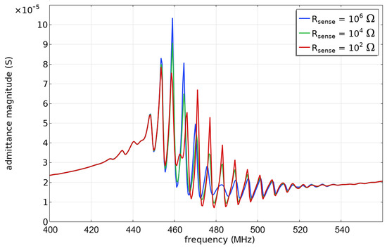 Of particular interest is the range of sensing resistor values that causes the full range of delay time and magnitude change. The changes in the envelope in Figure 4(bottom) are a result of the increases and decreases in admittance in Figure 4(top). Consequently, we can use simulations at a single frequency to find the sensing resistor range that causes changes in delay time or reflection magnitude. Figure 5 shows the admittance magnitude for three different frequencies near the emitter center frequency. The magnitude begins to change at about Rsense = 100 ohms and is saturated at Rsense = 105 ohms. Consequently, for best sensing, one should choose a sensing resistance without corrosion of less than 100 ohms. This value was calculated for an IDT width of 5 × 10−6 m, so for an IDT with aperture W, the sensing resistor should be less than (5 × 10−6 m/W[m])×100 ohms. In the experimental results presented later, the SAW device had an aperture of 1.6 mm; consequently, an uncorroded resistance of 0.31 ohms is optimal.