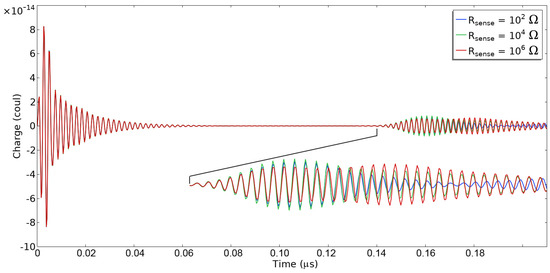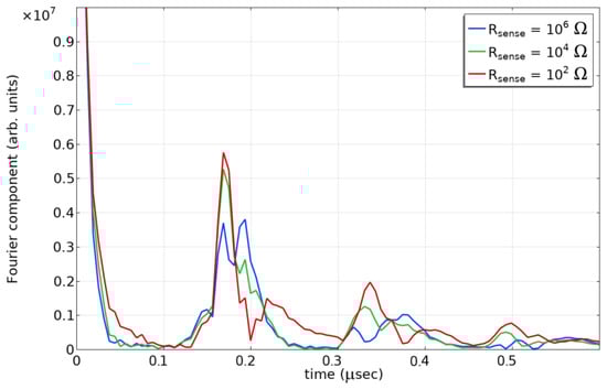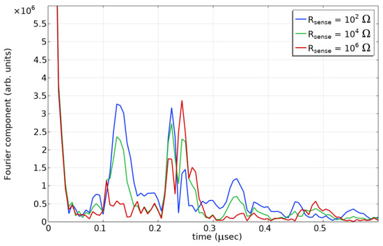To achieve better insight into the phase and time delay changes due to corrosion, we performed transient simulations. The simulations were performed in the time domain with the same conditions used for the frequency-dependent simulations except for a domain length of 226 × 10−6 m. The emitting IDT was excited by a 3-cycle windowed sinusoid with a center frequency f0 = 468 MHz. The time step was 1/8·f0, yielding a sufficient number of steps per sinusoidal period, and “strict” time-stepping was used. Figure 6 shows the simulation results for three resistance values. The emitter is resonant with an underdamped quality factor, so the initial ringing takes some time to decay, although in this case, the ringing does not prevent observation of the reflected pulse. The reflected pulse reaches a peak at a slightly shorter time for a small value of the sensing resistance, consistent with the frequency domain simulations. There is a consistent phase shift between shorted and open terminations of about 70 degrees. The predicted changes in the magnitude and phase of the reflected waves associated with the varying sensing resistance are small for 36° Y-X LiTaO3 devices. These results are consistent with the data reported in the literature. The literature [24,25] reports a small change in the reflection amplitude (a few dB) and phase (~45 degrees) associated with the variable resistive loading. Liu et al. [16] have used the P-matrix approach to predict the effect of loading on the SAW reflection or a YZ-LiNbO3 sensor. Luo et al. [17,26] have performed measurements on a loaded 128° Y-X LiNbO3 sensor. Tsai et al. [27] have performed an analysis using the coupling of modes model.