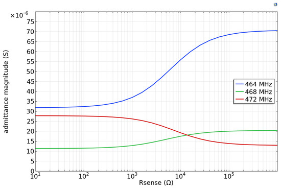 Admittance magnitude of the emitter for three different frequencies as a function of sensing resistance.