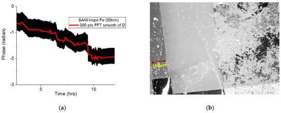 Experimental results from an Fe 50 nm coated IL-RDL sensor: (a) detected phase as a function of time, and (b) optical image of the film after the corrosion experiment.