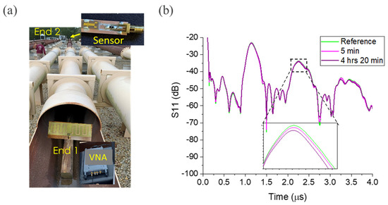 In addition to the lab test, the capability of the sensors for remote monitoring of in-pipe corrosion was tested in a 70 m long, 30″ outer diameter carbon steel pipe with a 0.25″ thick wall and open ends (Figure 8a). The pipe had multiple flanged sections bolted together, and the ends were open to the environment. It was located at Lazy Q Ranch, La Grange, TX, a test facility of Quanta Services. The sensor was attached to a 256 MHz dipole antenna and placed at one end of the pipe and was interrogated from the second end using a vector network analyzer (VNA) via another 256 MHz dipole antenna. The exciting power was 5 dBm. The wireless interrogation inside the pipe was performed in the guided TE11 electromagnetic wave mode [31]. Figure 8b shows the backscattered signal of the sensor recorded at different times after a corrosive (acidic) solution was dropped on the iron film. As shown in the inset, the attenuation and time delay (or phase) of the backscattered signal changed with time under the acidic solution and the change became prominent in about 4 h. No film was observed after the test under visual inspection. The measurements in the pipe showed a longer delay time for the IDT reflection consistent with the pipe length and the TE11 wave velocity.