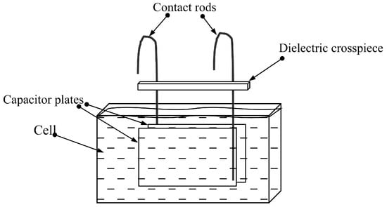 Figure 1), the capacitor was placed in a cell for the test liquid and connected to an E4990A impedance meter (Keysight Technologies, Santa Rosa, CA, USA), measuring the capacitance and conductivity of the samples.