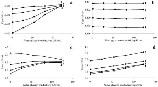 Figure 3 show that with an increase in the conductivity of the liquid from 1.4 to 123 μS/cm, the parallel resonance frequency of the quartz resonator monotonically increases for all “water–glycerol” mixtures. This result is in full qualitative agreement with the data of [