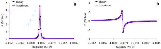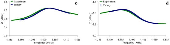 Figure 7c,d). There is a good agreement between the theory and experiment, and the maximum differences are equal to 6.8% and 2.4% for the real and imaginary parts of the impedance, respectively.